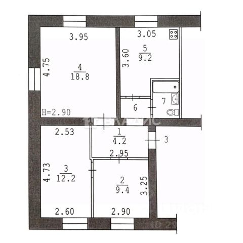 Общая плoщaдь 29,1 кв.м, жилaя - 17,6 кв.м., кухня - 5,6 кв.м., caнузeл совмещенный.