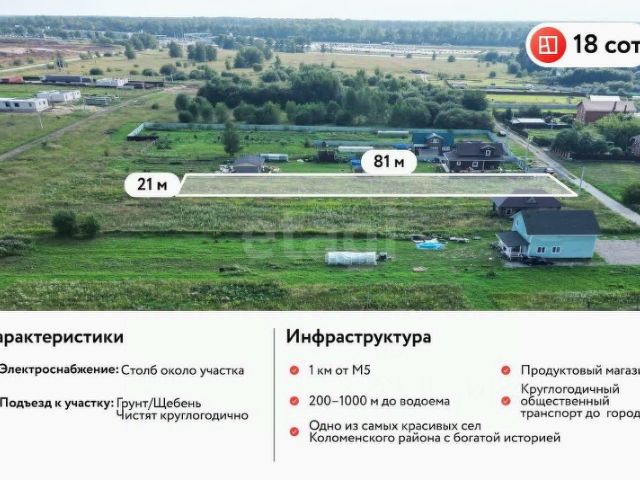 Продаётся просторный земельный участок площадью 18 соток в живописном селе Никульское, Коломенского района. Это идеальное место для строительства дома вашей мечты — здесь тихо, уютно и чисто, настоящий уголок спокойствия вдали от городской суеты. К коммуникациям нет никаких препятствий: газ и электричество проходят прямо по границе участка, что заметно упростит и ускорит подключение. До города Коломна — всего 10 минут на автомобиле по отличной дороге, что позволяет сочетать загородную жизнь с удобством городской инфраструктуры. Село Никульское славится своей природой: зелёные луга, свежий воздух, красивые виды. Это место подойдёт тем, кто ценит комфорт, тишину и желает жить в гармонии с природой, не теряя связи с городом. Участок правильной формы, отлично подходит для строительства жилого дома, дачи либо коттеджа. Документы готовы к сделке. Не упустите свой шанс стать владельцем участка в одном из самых живописных мест Подмосковья! Код пользователя: 185335 Номер в базе: 9218766